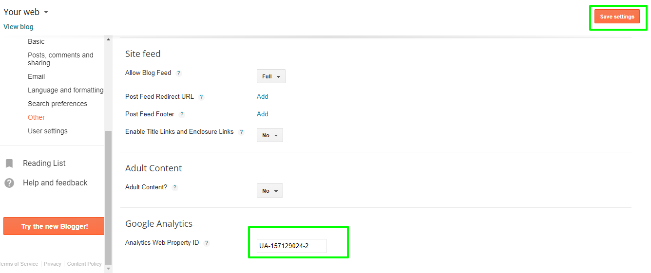 Copy the UA code from analytics and open blogger go to settings then click on other scroll down past the UA Code in under "Analytics Web Property ID" then copy coding from analytics and past on theme find the head and press enter button and past coding example ↓